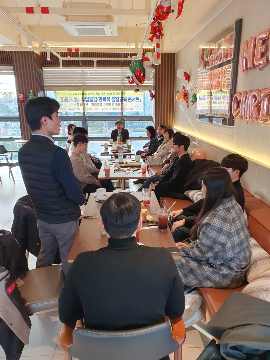 □ 경상북도영천교육지원청(교육장 주원영)은 12월 13일(화) 영천시내 카페에서 유·초등학교 수석교사 5명과 신규(저경력)교사 11명이 멘티-멘토를 맺어 8개월 동안 실시한 컨설팅 결과를 발표하고 1년을 돌아 보는 2022학년도 「화통, 수업공감·회복적 생활교육 마무리 콘서트」 를 실시하였다.