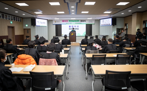 제15기 연천농업대학은 스마트팜과, 발효가공과 2개 과정 총 52명으로 편성·운영됐으며 이날 스마트팜과 15명, 발효가공과 18명 등 총 33명이 졸업식을 가졌다.