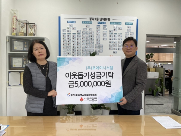 [금요저널] 인천 서구 청라1동 행정복지센터는 ㈜포에이시스템이 지난 19일 이웃돕기 성금 총 600만원을 전달했다고 밝혔다.