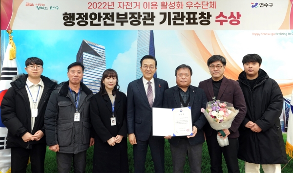 [금요저널] 연수구가 인천 기초단체 중 유일하게 행정안전부가 주관한 2022년 자전거 이용활성화 우수단체에 선정되며 행정안전부장관 표창을 수상했다.