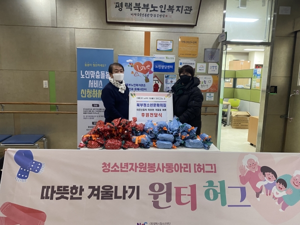 [금요저널] 평택시 위탁기관인 평택시북부청소년문화의집은 지난 23일 평택시북부노인복지관을 통해서 북부권역 독거노인들에게 북부청소년문화의집 자원봉사 동아리 [허그] 청소년들과 함께 직접 뜨개질한 목도리를 전달했다.