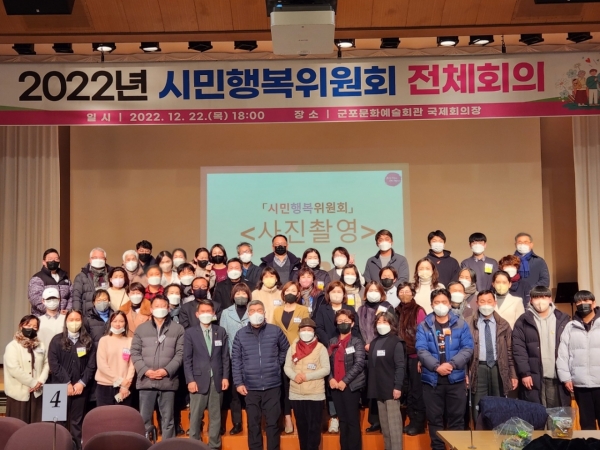 [금요저널] 군포시는 지난 12월 22일 군포문화예술회관 국제회의장에서 군포시 민관협치 기구인 시민행복위원회 전체 위원을 대상으로 전체회의를 개최했다이번에 개최된 전체회의는 시장을 비롯한 국회의원, 시의회 의장 등 내빈을 비롯한 시민행복위원 등 80여명이 참석해 활발한 토론을 펼쳤다.