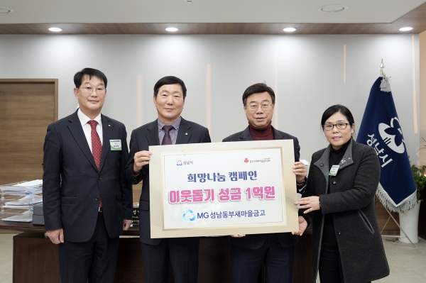 MG성남동부새마을금고는 성남시 한파취약계층 지원을 위해 12월 26일 성남시에 1억원의 성금을 맡겼다.