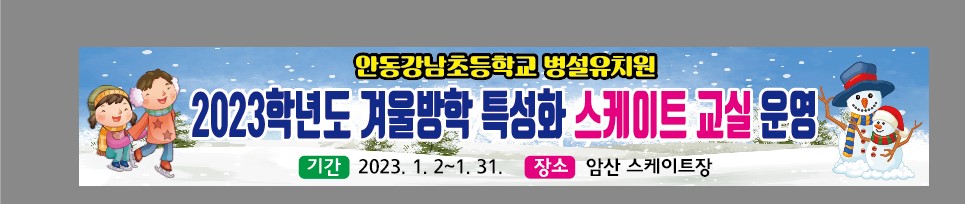 □ 안동강남초병설유치원(교장 이경순)은 전체 유아 71명을 대상으로 겨울 계절유치원 1월 2일(월)~1월 31(화)기간 동안 겨울방학 특성화 수업 얼음스케이트 교실을 남후면 암산 스케이트장에서 실시할 계획이다.