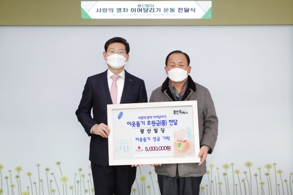 이 시장은 “신명이엔씨와 광산빌딩이 어려운 이웃을 돕기 위해 성금을 기탁해줘 감사하다”며 “매서운 한파로 어려운 시기를 보내고 있을 취약계층 이웃에게 소중하게 전달하겠다”고 말했다.