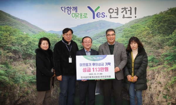 [금요저널] 연천군은 한국공인중개사협회 연천군지회로부터 연말연시 이웃돕기 성금 113만원을 전달받았다고 28일 밝혔다.