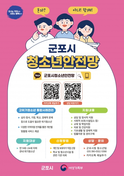 자세한 신청·문의는 군포시청 청소년청년정책과 청소년팀 또는 카카오톡채널 ‘군포시청소년안전망’ 가입 후 상담 신청을 하면 된다.