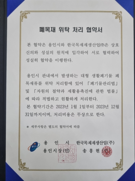 [금요저널] 용인특례시는 관내 재활용업체 한국목재재생산업과 대형폐기물 중 폐목재를 무상으로 처리하는 내용의 협약을 맺었다고 30일 밝혔다.