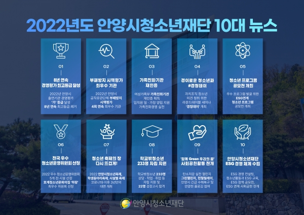 재단은 안양형 청소년 프로그램 개발을 위해 청소년운영위원회 등 자치조직 청소년을 대상으로 한‘경청 Day’라운드테이블 세미나와 ESG 연계 청소년 프로그램 공모전을 개최했으며 코로나19 이후 3년 만에 대면으로 개최된 안양시 청소년 축제 및 학생동아리 축제 소식도 10대 뉴스로 꼽혔다.