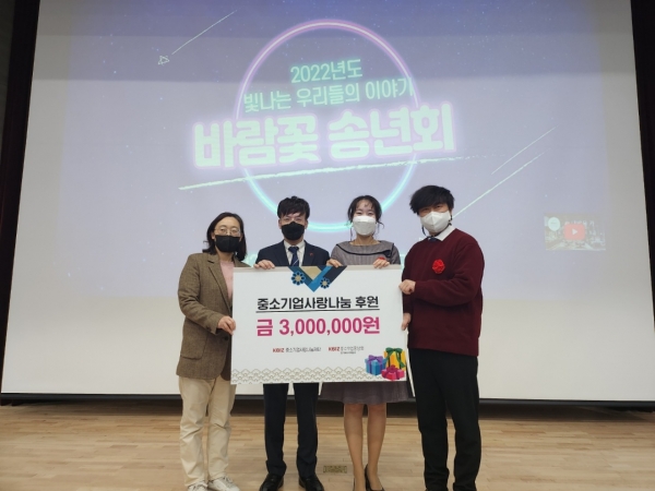 [금요저널] 중소기업중앙회 경기북부지역본부는 지난 29일 연천군종합복지관 대강당에서 진행된 바람꽃 송년회에서 임승종 중소기업중앙회 경기북부지역본부장, 남현주 바람꽃 원장 등 약 70명의 관계자들이 참석한 가운데 성금 300만원을 전달했다고 밝혔다.