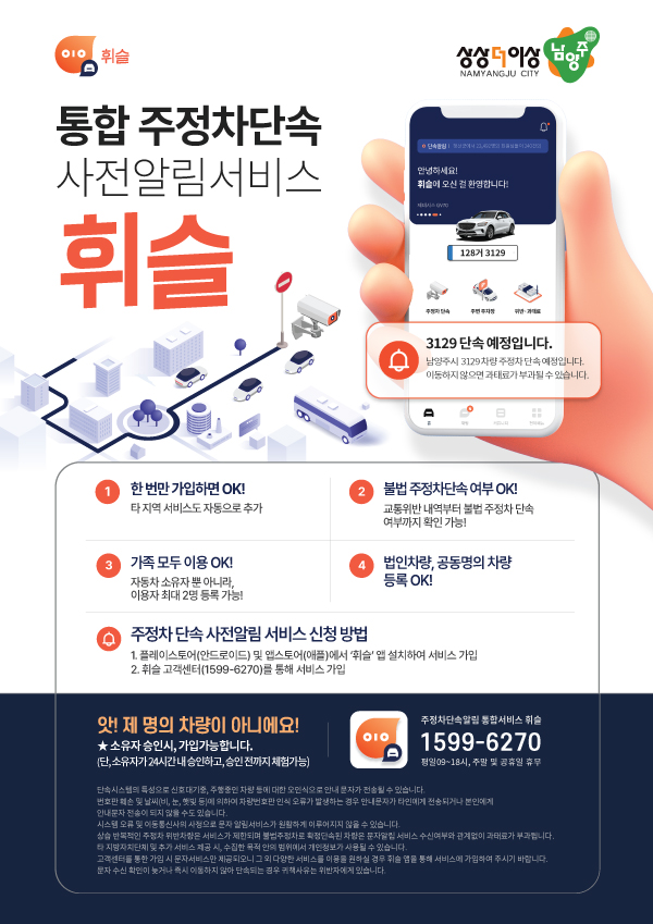[금요저널] 남양주시는 도로의 원활한 교통 흐름과 올바른 주차 문화 조성을 위해 전국 단위의 주·정차 단속 사전 문자 알림 통합 서비스를 운영한다고 2일 밝혔다.
