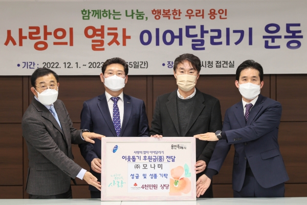 [금요저널] 용인특례시는 3일 관내 기업 2곳이 시의 연말연시 이웃돕기 운동 ‘사랑의 열차 이어달리기’에 성금과 문구류를 기탁했다고 밝혔다.