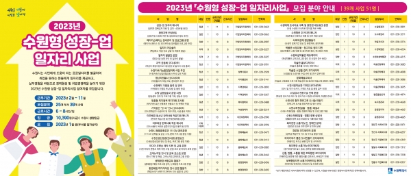 수원시 관계자는 “취업을 희망하는 시민들에게 디딤돌이 될 수원형 성장-업 일자리 사업에 많은 관심과 참여를 부탁드린다”고 말했다.