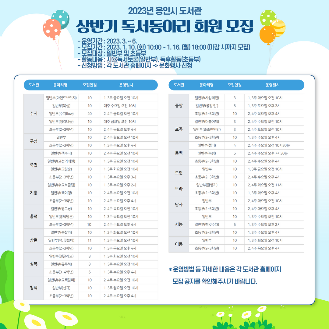 용인중앙도서관과 포곡도서관, 동백도서관, 모현도서관, 보라도서관, 남사도서관, 서농도서관, 이동도서관 등에서 진행된다.