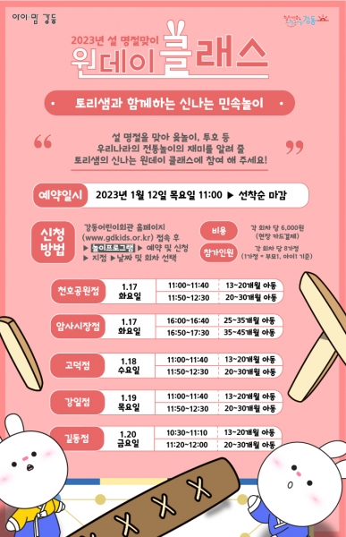 [금요저널] 강동구는 계묘년 새해 첫 명절을 맞아 지역의 영유아들이 쉽고 재미있게 전통놀이를 접할 수 있도록 원데이클래스를 운영한다고 밝혔다.