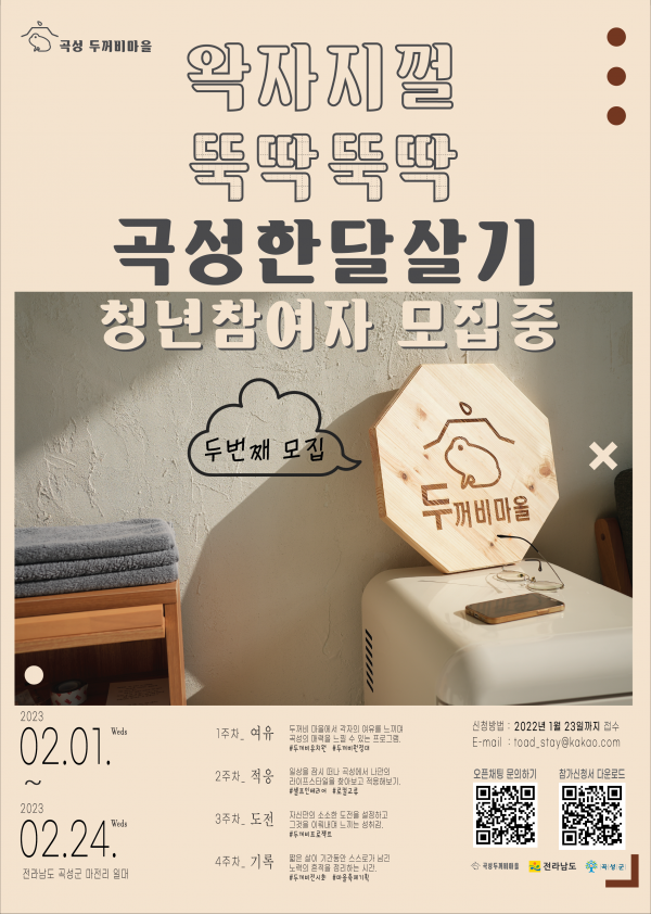 곡성군 관계자는 “청년들이 두꺼비마을에서 특별한 가치와 새로운 기회를 발굴할 수 있기를 바란다 두꺼비마을 2기 모집에도 많은 관심 부탁드린다”고 전했다.