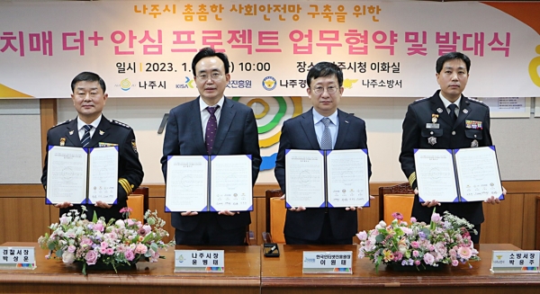 전라남도 나주시는 지난 10일 한국인터넷진흥원, 나주경찰서 소방서와 치매환자 등 취약계층 사회안전망 구축을 위한 ‘치매 더+ 안심 프로젝트 업무 협약’을 체결했다고 11일 밝혔다.