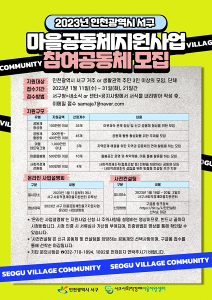 [금요저널] 인천 서구가 ‘2023 서구 마을공동체만들기지원사업’에 참여할 공동체를 모집한다고 11일 밝혔다.