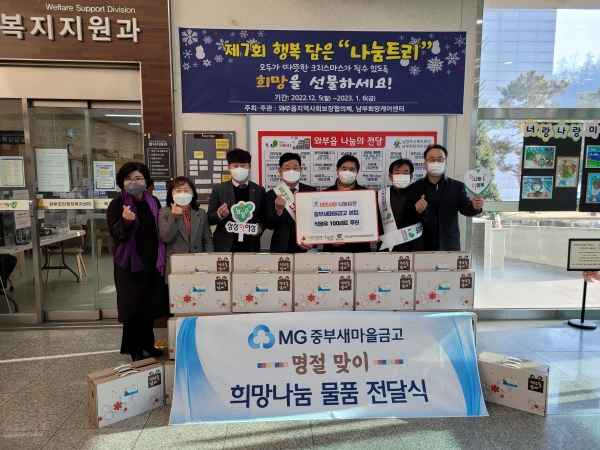 MG중부새마을금고 박백순 이사장은 “지역의 어려운 이웃들이 풍성하고 행복한 설 명절을 보내길 바라는 마음으로 후원 물품을 준비했다”며 “새해에도 지속적인 나눔 실천과 봉사 활동으로 따뜻한 지역 사회를 만드는 데 힘을 보태겠다”고 말했다.