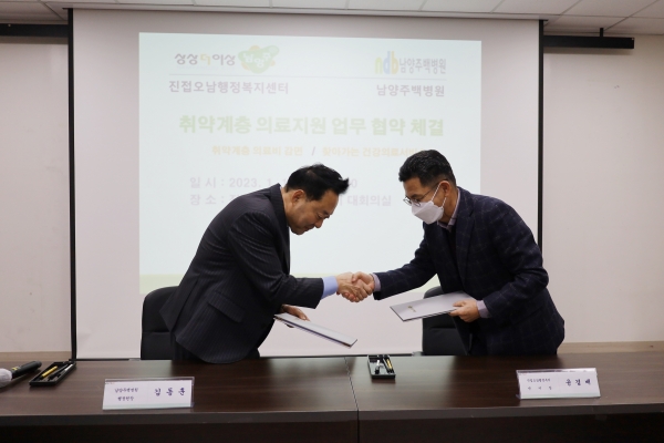 [금요저널] 남양주시 진접오남행정복지센터는 지난 12일 남양주백병원과 ‘취약계층 의료지원을 위한 업무협약’을 체결했다.