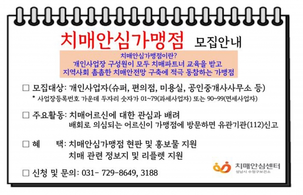 [금요저널] 성남시는 연중 치매안심 가맹점을 모집한다.