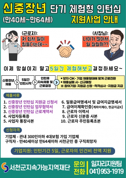 희망 구직자는 만 40세~만 64세 이하의 서천군민이라면 누구나 지원할 수 있으며 관내 기업에 5일간 단기 인턴으로 직무를 체험한 후 기업과 구직자의 의사에 따라 정규직으로 전환된다.
