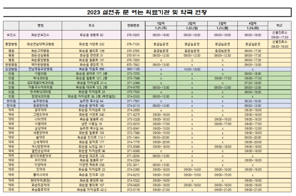 보건소관계자는 “연휴에도 군민들이 의료 이용에 불편이 없도록 보건소 등 공공보건의료기관, 문여는 병·의원, 약국 등 운영에 최선을 다 하겠다”고 말했다.