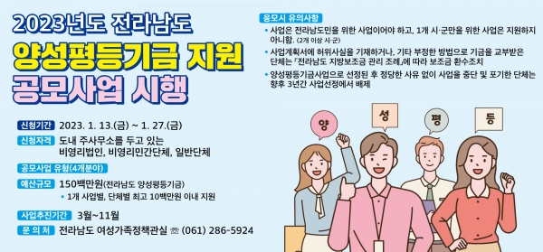 김종분 전남도 여성가족정책관은 “변화하는 사회에 발맞춰 성평등 사회를 조성하기 위해 올해 양성평등기금 공모사업 신청 자격을 확대했다”며 “여성권익 신장과 양성평등 실현을 위한 다양한 사업을 추진할 계획”이라고 말했다.