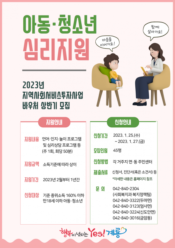 [금요저널] 계룡시는 오는 25일부터 27일까지 지역사회서비스투자사업의 일환으로 ‘2023년 상반기 아동·청소년 심리지원서비스’ 이용자 45명을 모집한다고 밝혔다.
