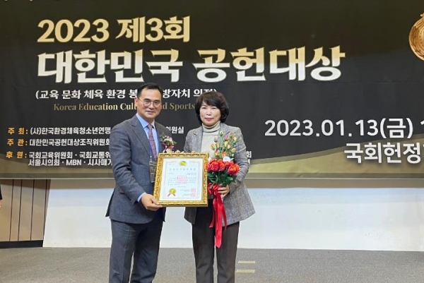 한국환경체육청소년연맹 유범진 이사장과 김선교 국회의원이 공동으로 주최한 ‘제3회 대한민국공헌대상’은 교육·문화·체육·환경·봉사·의정·지방자치 7개 분야에서 단순히 결과가 아닌 과정을 중시해 관심의 사각지대에서 사회발전을 위해 묵묵히 공헌한 숨은 인물들을 발굴해 시상하는 자리로 코로나19 팬데믹으로 3년만에 대면으로 진행돼 의미를 더했다.