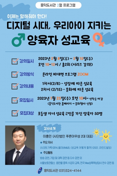 성교육 웹툰 ‘시크릿 가족’의 저자인 이충민 사단법인 푸른아우성 대표가 강사로 나와 성장에 따른 성교육, 문화에 따른 성교육 등 2회에 걸친 시리즈로 강의를 진행한다.