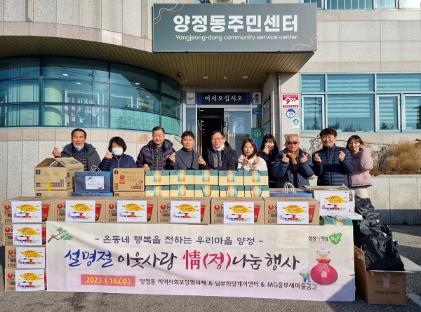 이번 행사에서는 MG중부새마을금고와 남부희망케어센터, 양정동 지역사회보장협의체 박미순 감사가 후원한 식용유 세트, 쌀 10kg, 떡국 밀키트, 떡국떡, 햄 선물 세트, 라면 등 400여 개의 물품을 128가구에 전달했다.