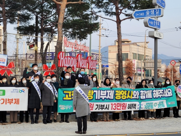 [금요저널] 광양시는 올해 처음 시행된 고향사랑기부제의 활성화를 위해 18일 광양읍 인동로터리에서 농협광양시지부와 광양시 직원 50여명이 참여한 고향사랑기부제 홍보 캠페인을 실시했다고 밝혔다.