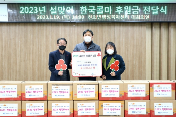 박원용 전의면장은 “추운 겨울 소외된 이웃을 위해 따뜻한 지원을 해 주신 한국콜마 임직원 여러분에게 진심으로 감사드린다”며 “어려운 이웃의 쓸쓸하고 추운 명절을 따뜻하게 바꿔주셨다”고 말했다.