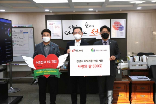 [금요저널] 주식회사 빙그레가 지난 18일 오후 천안시와 천안시복지재단이 함께 추진하는 ‘우리아이 수호천사 되어주기’ 캠페인에 동참하며 사랑의 쌀을 천안시에 전달했다.