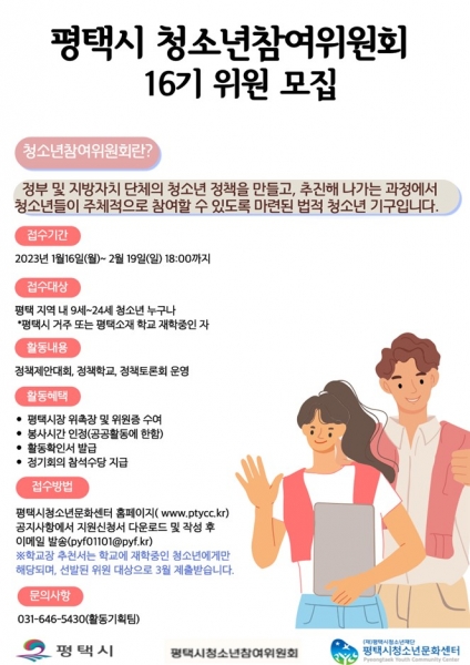 [금요저널] 평택시청소년재단 평택시청소년문화센터는 2023년에 활동할 평택시 청소년참여위원회 16기 신입위원을 모집한다고 밝혔다.
