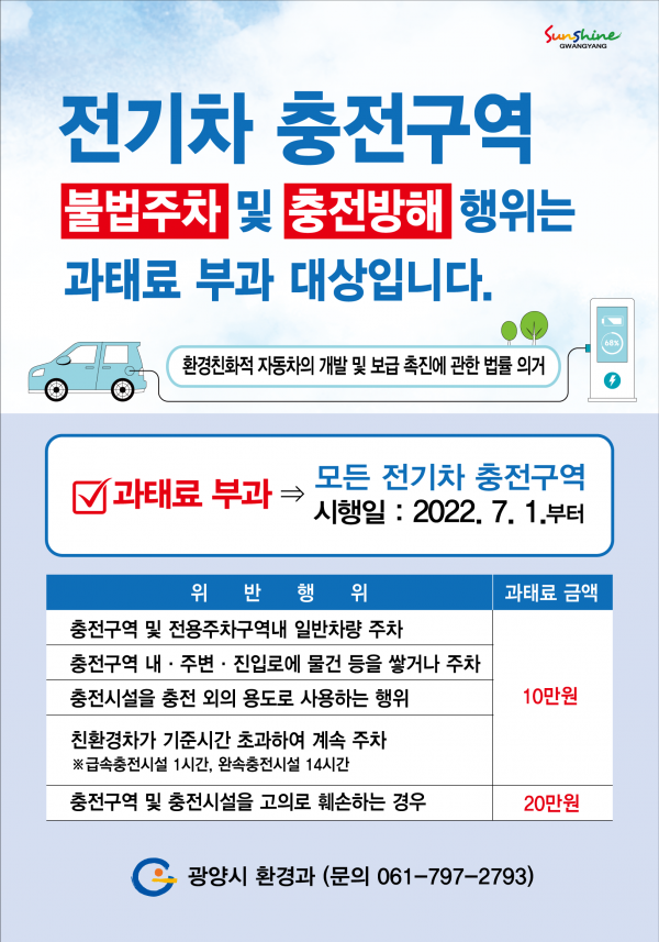 김재희 환경과장은 “전기차 전용 충전구역 불법 주정차에 따른 과태료로 인해 주민들이 불이익을 받지 않도록 지속적인 홍보를 실시하겠다”며 “공동주택 관리사무소의 관리강화와 올바른 주차 질서가 확립될 수 있도록 시민들의 적극적인 참여도 당부드린다”고 말했다.