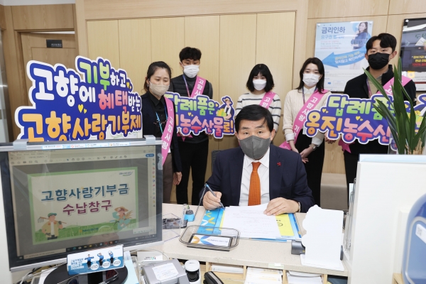 문 군수는 고향사랑기부제 시행 이후 첫 명절을 맞아 1월 20일 NH농협은행 옹진군청 출장소에서 자매도시인 전남 신안군과 구례군에 고향사랑기부금을 전달했다.