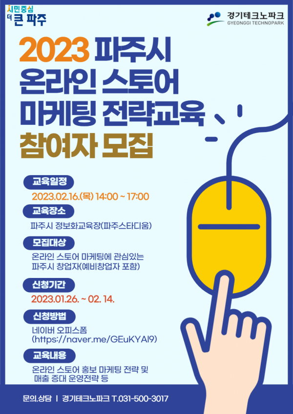 교육 참여 대상자는 파주시 온라인 스토어 창업자 또는 온라인 마케팅에 관심이 있는 예비창업자 40명으로 2월 14일까지 네이버 오피스폼에서 신청할 수 있으며 자세한 사항은 네이버 블로그를 통해 확인할 수 있다.