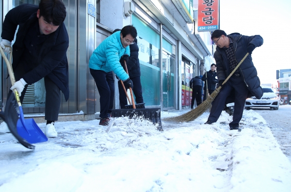 연휴가 끝나고 첫 출근일인 25일에는 강진원 군수를 비롯한 강진군청 전 직원이 주요 인도와 이면도로 제설작업을 실시했다.