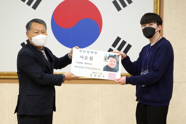 취임식에서는 공직체험에 참여중인 대학생 2명이 강진군민이 된 부군수에게 환영의 선물로 ‘강진군민증’과 다산의 대표 저서를 새긴 특화 먹거리 ‘강진책빵’을 전달했다.
