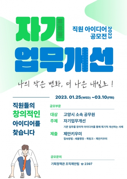 [금요저널] 고양특례시는 민선8기 공약사항 및 시정 역점사업 성공적 추진 아이디어 발굴을 위해 고양시 직원을 대상으로 ‘자기업무개선 공모전’을 개최한다.