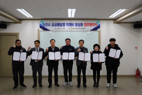 이날 협약식에는 순천시를 포함해 전라남도 자영업종합지원센터, 소상공인연합회 순천시지부, 한국외식업중앙회 순천시지부, 순천시 음식사랑협회, ㈜먹깨비, 탑서비스 등 총 7개의 기관·단체가 참여했다.