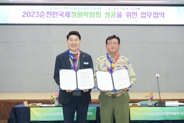 [금요저널] 순천만국제정원박람회조직위원회와 한국스카우트전남연맹이 30일 순천만국제습지센터에서 2023순천만국제정원박람회 성공 개최 및 청소년 문화체험 활성화를 위한 업무협약을 체결했다.