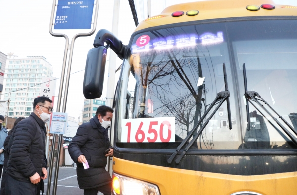 최 시장은 이날 오전 7시 35분 범계사거리에서 1650번 광역노선 출근형 전세버스에 올랐다.