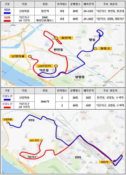 고양시 관계자는 “대덕동 주민들의 대중교통 불편 해소 방안을 서울시와 지속적으로 논의한 결과 이 같은 결실을 거뒀다”며 “기존에 운행하는 022A번과 022B번 마을버스는 이달 내에 변경된 노선으로 운행할 계획이며 신설되는 2개 노선은 빠른 시일 내 운행할 수 있도록 하겠다”고 말했다.