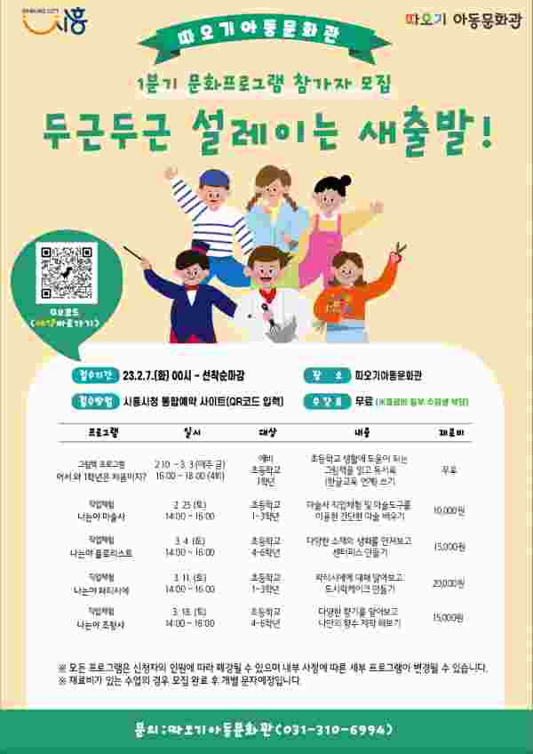 신청은 포스터의 QR코드 및 시흥시청 누리집 ‘통합예약’ 포털에서 할 수 있으며 기타 문의 사항은 시흥시 따오기아동문화관으로 하면 된다.