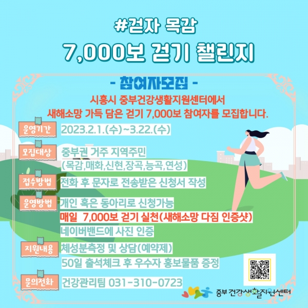 [금요저널] 시흥시는 새해를 맞아 중부권 지역주민의 걷기 생활 실천을 위한 ‘걷자 목감 7,000보 걷기챌린지’ 1기 참여자를 모집한다.