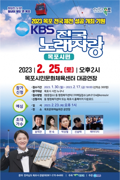 목포시는 오는 10월과 11월의 제104회 전국체육대회와 제43회 전국장애인체육대회의 성공을 기원하는 KBS 전국노래자랑’목포시편 공개 녹화가 오는 25일 오후 2시 목포시민문화체육센터 대공연장에서 열린다고 밝혔다.