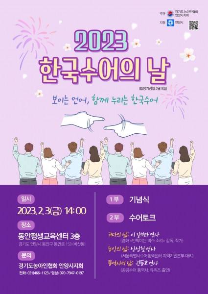 안양시에 따르면, 경기도농아인협회 안양시지회는 3일 오후 2시 동안평생교육센터 3층 대강당에서 ‘2023년 한국수어의 날 기념식’을 개최했다.